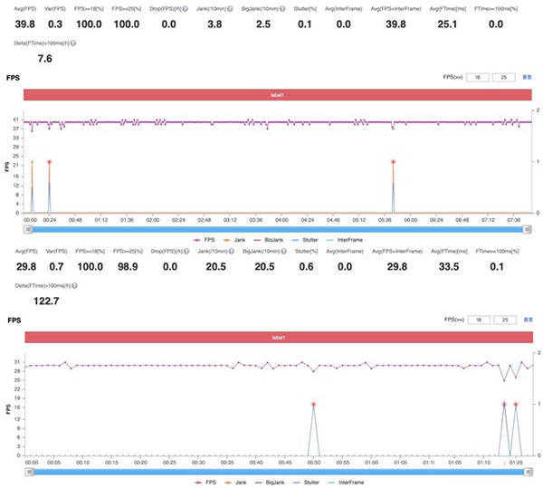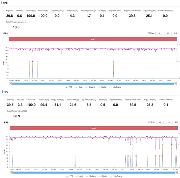 從圖表可以看出,iQOO Z3和Redmi Note9 Pro在以同樣高幀率模式下運(yùn)行《王者榮耀》時(shí)二者幀率基本可以保持接近60幀的狀態(tài);而兩款手機(jī)在同樣的高幀率高畫質(zhì)條件下運(yùn)行《和平精英》時(shí)iQOO Z3的幀率能夠平穩(wěn)地保持在39.8幀,而Redmi Note9 Pro則是29.8幀且整條幀率曲線并不平穩(wěn);在《使命召喚手游版》中iQOO Z3和Redmi Note9 Pro的幀率表現(xiàn)則是相近的,前者平均幀率為39.8幀,后者為39.5幀。