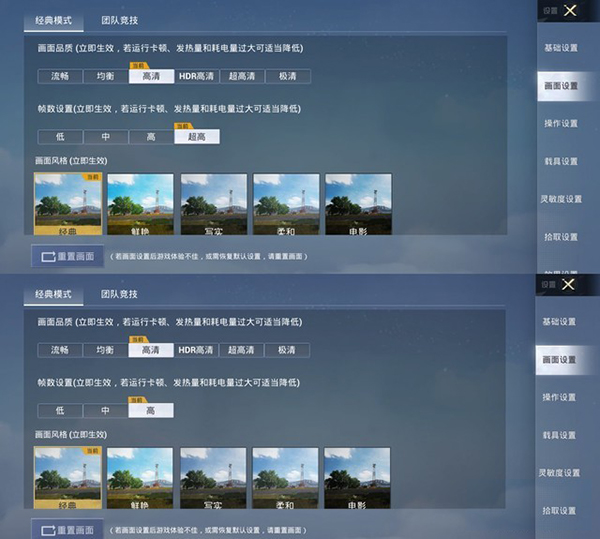 《和平精英》游戲畫面設(shè)置(上iQOO Z3,下Redmi Note9 Pro)