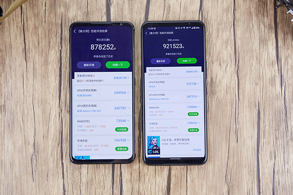 (魯大師跑分,左為紅魔6,右為ROG游戲手機(jī)5)
