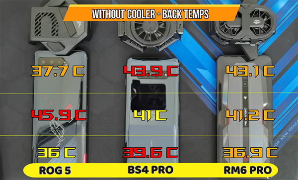 在游戲體驗(yàn)中,手機(jī)的散熱能力一直也是不少玩家關(guān)注的一項(xiàng)重要指標(biāo)。在進(jìn)行30分鐘原神游戲之后,三款手機(jī)在未裝配風(fēng)扇的情況下,ROG游戲手機(jī)5的機(jī)身上半部分溫度為37.7℃,下部溫度為36℃,中間溫度最高為45.9℃,這樣的溫度表現(xiàn)得益于ROG考慮到手持舒適度而將CPU中置,這樣一來,即便手機(jī)中部溫度較高也不會(huì)感到燙手,長時(shí)間手持也能全程確保舒適度。而其他兩款手機(jī)的上部溫度均達(dá)到了40℃以上,手感燙手是難免的了。