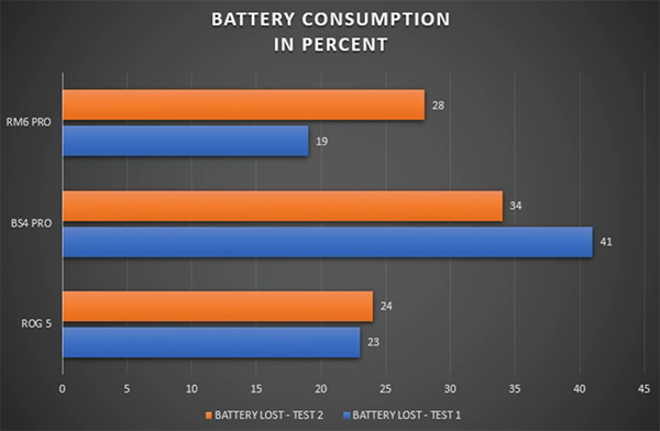 同樣在功耗方面,三款手機(jī)也各有勝負(fù),在兩次測試中,ROG游戲手機(jī)5和紅魔6 Pro消耗電量同樣低,都是47%的電量,不同的是,ROG游戲手機(jī)5兩次測試消耗電量僅相差了1%,而紅魔6 Pro則存在明顯差距,很明顯在功耗優(yōu)化方面,ROG游戲手機(jī)5更勝一籌。