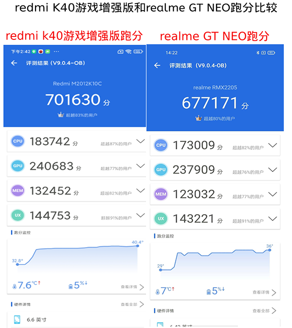 我們先進行數(shù)據(jù)的梳理,先從性能上面來講。這兩款手機都是搭載了天璣1200處理器,但是跑分卻大不相同,Redmi官方數(shù)據(jù)說在特定環(huán)境下跑了72.4萬,不過經(jīng)過安兔兔跑分實測70萬;而realme真我GT Neo就更夸張,竟然只跑了67萬,整整相差3萬分,這其中的3萬到底丟哪去了!