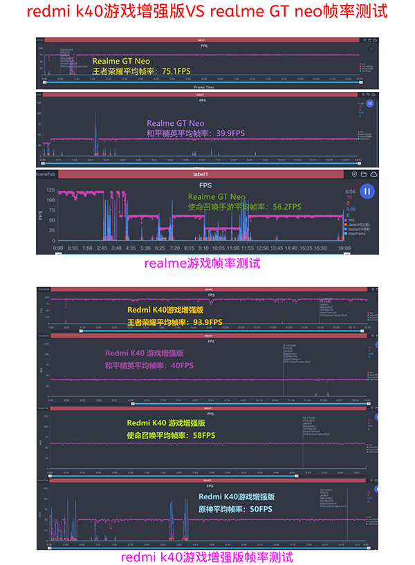 我們來測下它的性能吧,以王者榮耀、和平精英、使命召喚手游以及原神來對比。目前的測評都是把游戲開到最高幀率來測評的,realme真我GT Neo王者榮耀的平均幀率為75fps,和平精英平均幀率為40,召喚使命平均幀率56;而Redmi游戲手機王者榮耀的平均幀率高達94,比真我多了整整20fps,這可以說是大跳水。另外和平精英跟召喚使命分別為58fps、50fps,綜合起來realme與Redmi相比相差挺大的!