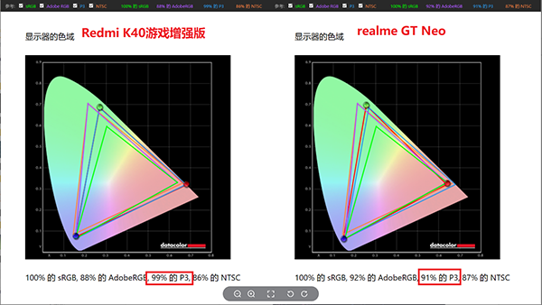 另外大家可以看下顯示器的色域,數(shù)據(jù)很明顯,Redmi游戲手機更勝一籌!