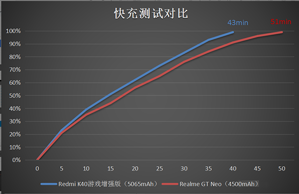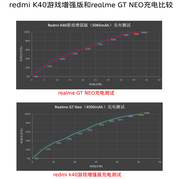 Redmi游戲手機使用的是67W超級快充,而realme真我GT Neo僅搭配了50W的。所以Redmi游戲手機能在43分鐘內(nèi)把電充滿,realme真我GT Neo卻用了51分鐘。電池比你大就算了沒想到充電還比你快!