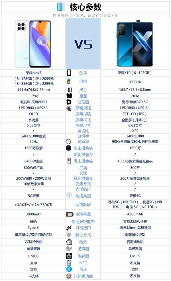 榮耀play5和榮耀X10這兩款手機(jī)的核心配置對比情況,請參考上圖。