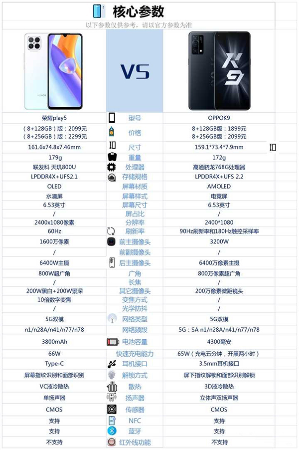 OPPO K9和榮耀play 5這兩款手機的核心配置對比情況,請參考上圖。