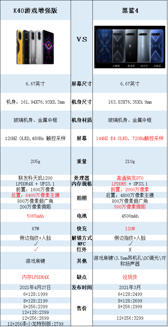 在2021年3月份,小米游戲手機黑鯊4發(fā)布后,不少的人在關(guān)注這個手機了,而在就在4月27日,小米Rdemi K40系列又發(fā)布了一款游戲增強版,定位相同?同室操戈?不存在的,那這兩款同為游戲手機,到買哪一個好呢,下面我們來詳細對比一下: