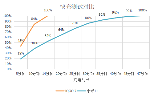 在充電方面,iQOO 7注重有線充電的速度,小米11則更傾向于充電速度夠用,充電方式夠全。從參數(shù)來看,iQOO 7的有線充電速度達(dá)到120W,小米11則為55W,實(shí)際測(cè)試中的成績(jī)?nèi)缦聢D: