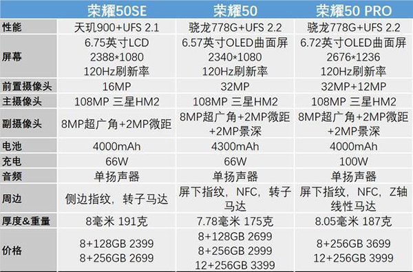 先看看榮耀50系列的三款產(chǎn)品,哪款更值得買一些,通過對比不難發(fā)現(xiàn),榮耀50系列中,榮耀50這款產(chǎn)品更值得購買,榮耀50SE這種天璣900+LCD屏幕的手機就不說了,榮耀50和榮耀50 Pro之間主要是屏幕有一點差異,但是榮耀50更輕巧,而且價格也明顯更具有競爭力,因此如果你要購買榮耀50系列的手機的話,記得選擇榮耀50就行了,SE和Pro可以直接PASS。
