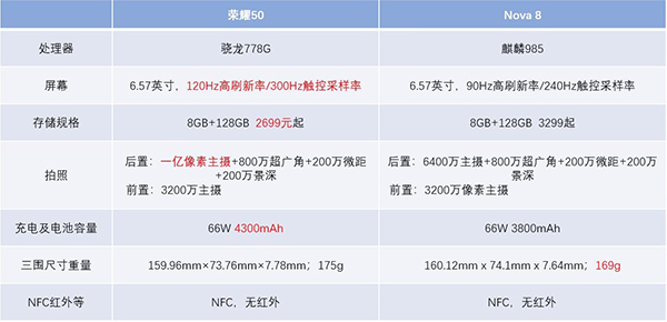 充電和電池部分,榮耀50和Nova8都支持66W的超級快充,榮耀50的電池要更大一些,為4300mAh。但是榮耀50只比Nova8重了6g,6g的重量換500mAh電池,還是很值得的。