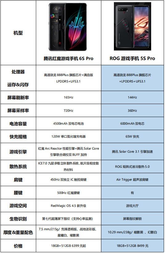 此外,性價比方面,相同配置水準的ROG游戲手機5S Pro和騰訊紅魔游戲手機6S Pro價位相差較大。同為最高配置的機型,ROG游戲手機5S Pro 18GB+512GB售價達到了8499元,騰訊紅魔游戲手機6S Pro 18GB+512GB售價則僅為6399元,綜合對比下來,紅魔的性價比表現(xiàn)得更實在,擁有更大誠意。2100元的差價足以讓比較追求性價比的用戶更偏向于紅魔。