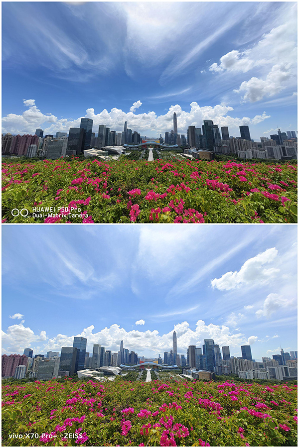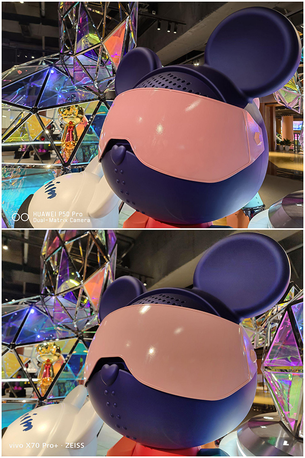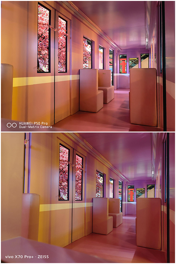 超廣角方面,由于HDR效果也都參與其中,兩款機(jī)型的色彩表現(xiàn)都保持了較高的水準(zhǔn)。不過在細(xì)節(jié)方面,vivo X70 Pro+傳感器的優(yōu)勢盡顯,縮放300%后細(xì)節(jié)表現(xiàn)明顯好于華為P50 Pro。