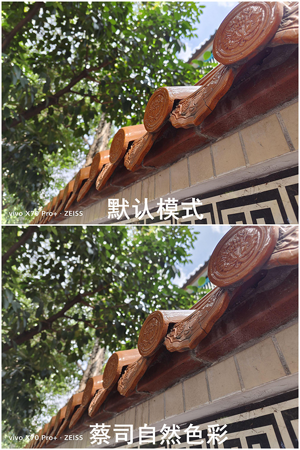 vivo X70 Pro+這次還專門加入了一個蔡司自然色彩選項(xiàng),在拍照界面的正上方即可手動開啟。開啟后畫面鮮明程度會降低,觀感上更貼近真實(shí)。