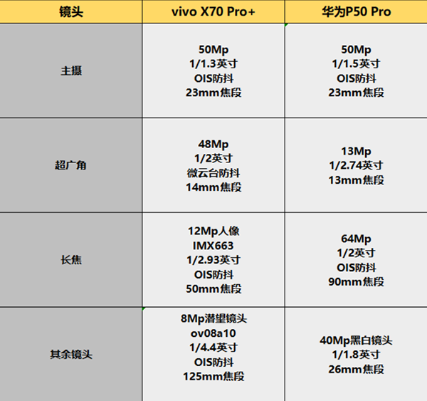 作為兩款機(jī)型公認(rèn)的主打功能,影像應(yīng)該是兩款機(jī)型最大的看點(diǎn)之一。下圖是兩款機(jī)型在鏡頭方面的詳細(xì)參數(shù),整體來看vivo X70 Pro+鏡頭所覆蓋的焦段更豐富,全鏡頭光學(xué)防抖和T*鍍膜同樣是其亮點(diǎn),再加上主攝覆蓋的1G(玻璃)+6P鏡片組合,整體鏡頭堆料要優(yōu)于華為P50 Pro。