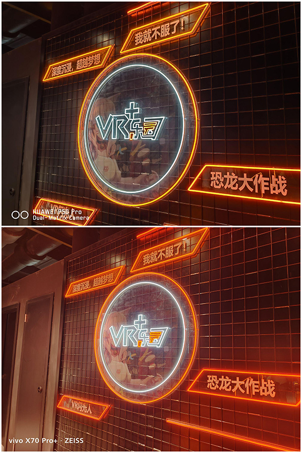 夜景方面,兩部手機(jī)的成像風(fēng)格略有不同,主要差異點(diǎn)在于高亮部分的抑制邏輯、vivo X70 Pro+的高亮部分有一定抑制,但干預(yù)程度不高,在部分場景下會有定的溢出;華為P50 Pro的高光抑制更加激進(jìn),不過同樣會減少畫面的層次感。