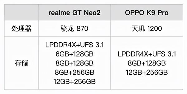 性能方面,兩款機(jī)型的存儲(chǔ)規(guī)格都相同,RAM規(guī)格都是LPDDR4X,ROM規(guī)格都是UFS3.1,主要區(qū)分點(diǎn)在于處理器。