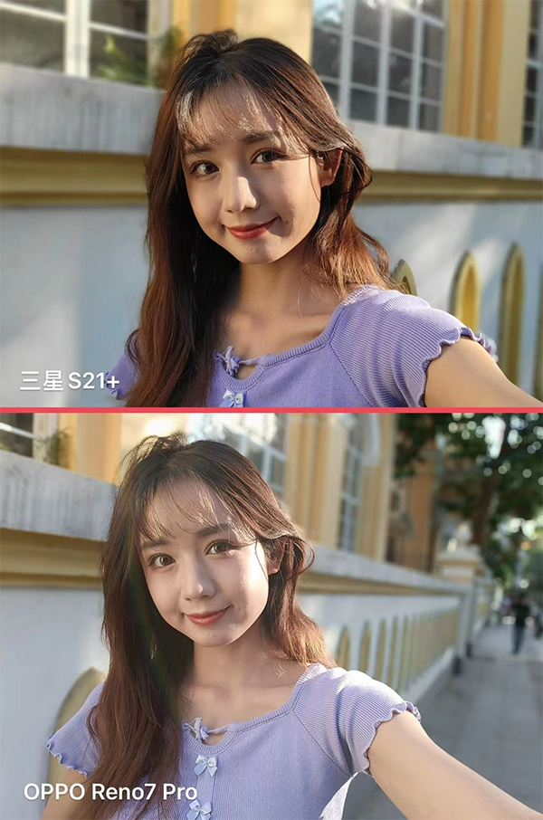 當(dāng)然,OPPO Reno7 Pro最吸引我的一點還是它的影像體驗,這部手機在前置方面配備了一枚3200萬像素的自拍鏡頭,不過它最大的亮點在于搭載了全球首發(fā)的索尼IMX709超感光貓眼鏡頭,該傳感器集成了OPPO自研的RGBW圖像融合單元,感光能力提升很大,基本能滿足用戶在不同環(huán)境下的自拍需求。從下面實拍樣張可以看出來,OPPO Reno7 Pro無論是人物細(xì)節(jié)還是美顏算法的表現(xiàn)都很到位,小姐姐臉蛋看上去白里透紅、自然通透,并且90°廣角畫面也能比S21+收納更多的畫面內(nèi)容。