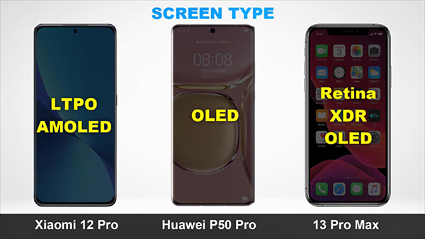 小米12 Pro、華為P50 Pro、iPhone 13 Pro Max這三部機(jī)型的屏幕材質(zhì),分別為L(zhǎng)YPO AMOLED、OLED和Retina XDR OLED材質(zhì),其中小米12 Pro搭載的是第二代LTPO自適應(yīng)刷新率技術(shù)