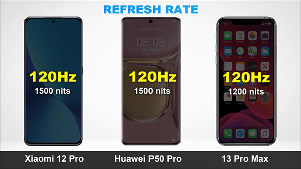 小米12 Pro、華為P50 Pro、iPhone 13 Pro Max最高均支持120赫茲刷新率,并且都是自適應(yīng)的刷新率調(diào)節(jié)。在屏幕的亮度上,小米12 Pro最高支持1500nits峰值亮度,華為P50 Pro最高支持1500nits峰值亮度、iPhone 13 Pro Max最高支持1200nits峰值亮度。