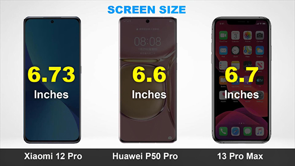 小米12 Pro、華為P50 Pro、iPhone 13 Pro Max的屏幕尺寸分別為6.73英寸、6.6英寸、6.7英寸,其中尺寸最大的依然是小米12 Pro,華為P50 Pro的屏幕尺寸最小。
