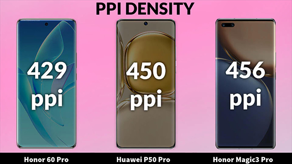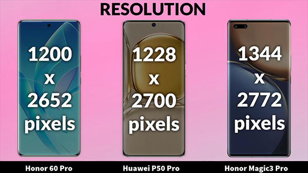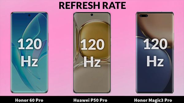 在屏幕的分辨率方面,榮耀60 Pro、華為P50 Pro和榮耀Magic3 Pro分別采用了1200X2652像素、1228X2700像素、1344X2772像素的設計,并且這三部手機都是采用的曲面屏設計,屏幕的像素密度分別為429PPI、450PPI、456PPI。而在屏幕的刷新率方面,榮耀60 Pro、華為P50 Pro和榮耀Magic3 Pro均支持最高120赫茲的刷新率。