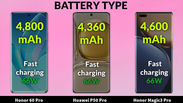 榮耀60 Pro、華為P50 Pro和榮耀Magic3 Pro分別搭載了4800毫安電池、4360毫安電池、4600毫安電池,并且這三部手機均支持66W的有線快充技術(shù)。