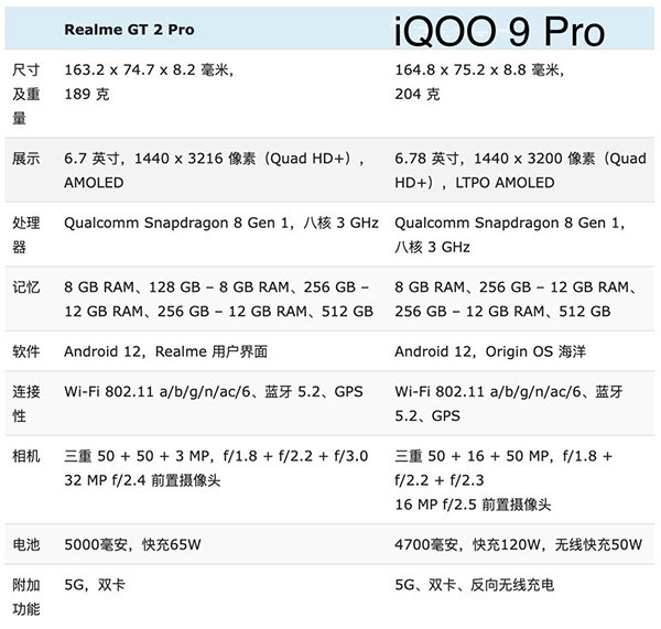 realme GT2 Pro與iQOO 9 Pro詳細(xì)參數(shù)對比圖如下,優(yōu)缺點(diǎn)很明顯