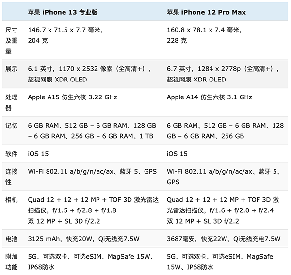 以下是iPhone 13 Pro與iPhone 12 Pro Max詳細(xì)參數(shù)對比圖,優(yōu)缺點(diǎn)一目了然