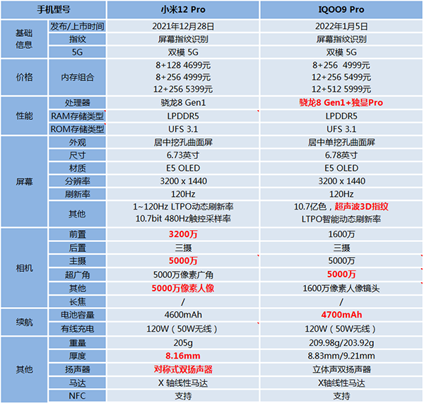 小米12 Pro和iQOO 9 Pro參數(shù)對(duì)比:
