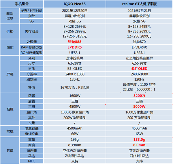 iQOO Neo5S和realme真我GT探索版參數(shù)圖: