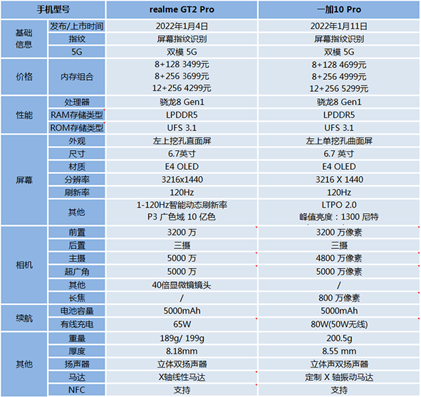 realme真我GT2 Pro和一加10 Pro參數(shù)圖: