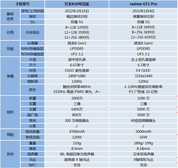 紅米K50電競版和realme真我GT2 Pro參數(shù)圖: