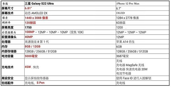 三星Galaxy S22 Ultra與iPhone 12 Pro Max詳細(xì)參數(shù)對比圖如下,區(qū)別很明顯
