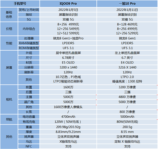 iQOO 9 Pro和一加10 Pro參數(shù)圖: