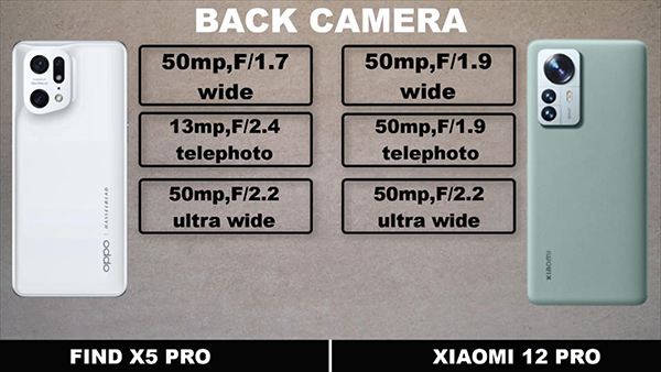 OPPO Find X5 Pro搭載的是5000萬(wàn)像素的主攝、5000萬(wàn)像素的超廣角相機(jī)和1300萬(wàn)像素的長(zhǎng)焦相機(jī),小米12 Pro搭載的是5000萬(wàn)像素的主攝、5000萬(wàn)像素的超廣角相機(jī)和5000萬(wàn)像素的人像鏡頭,同時(shí)也支持變焦拍照。