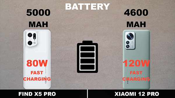 OPPO Find X5 Pro的電池容量為5000毫安,支持80W的有線快充。小米12 Pro的電池容量為4600毫安,支持最高120W的有線快充。