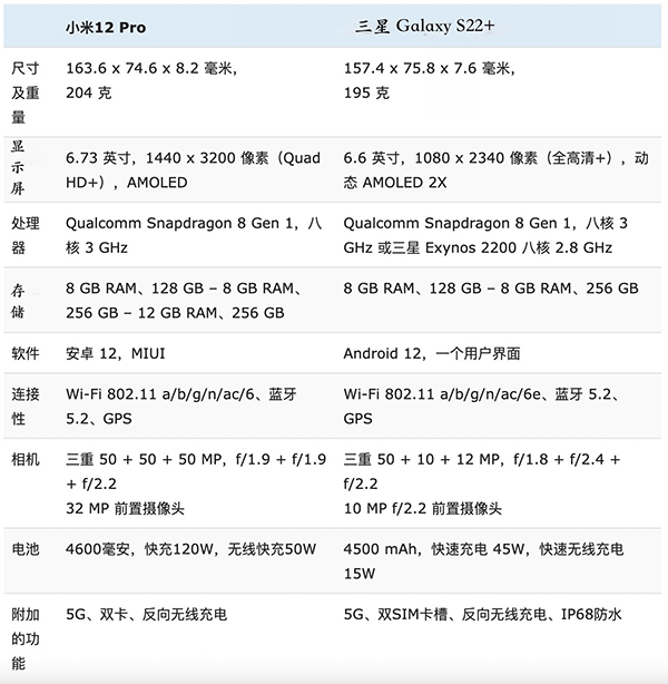 小米12 Pro與三星Galaxy S22+詳細(xì)參數(shù)對(duì)比圖如下: