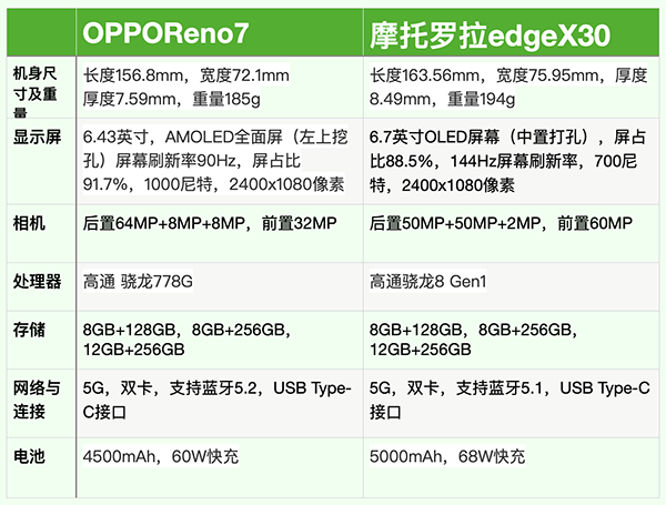 OPPO Reno7與摩托羅拉edge X30主要參數對比圖如下: