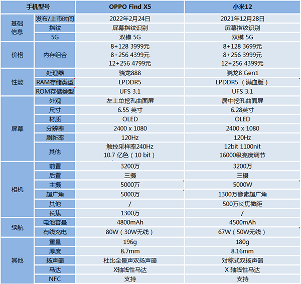 OPPO Find X5和小米12參數(shù)圖:
