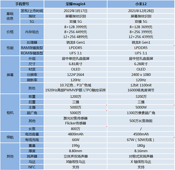 榮耀Magic4和小米12參數(shù)圖:
