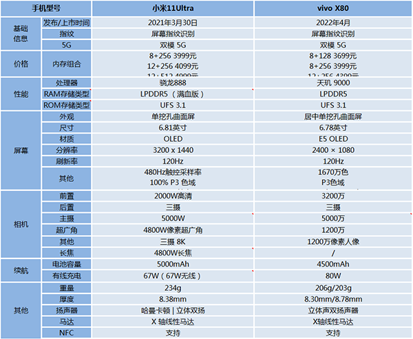 小米11 Ultra和vivo X80參數(shù)圖