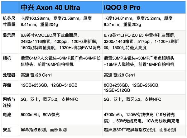 中興Axon40 Ultra與iQOO 9 Pro主要參數(shù)對(duì)比圖: