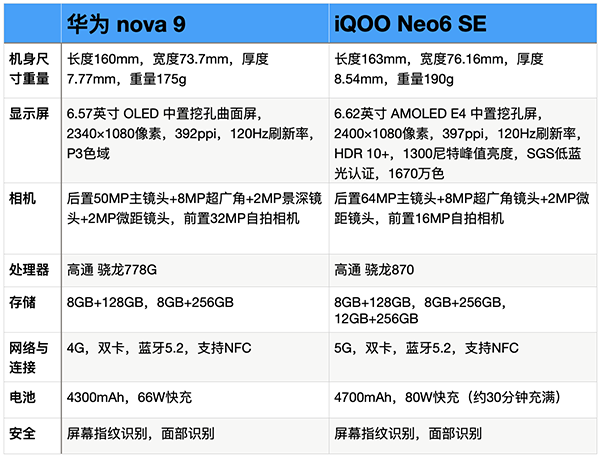 華為nova9與iQOO Neo6 SE主要參數(shù)對比圖: