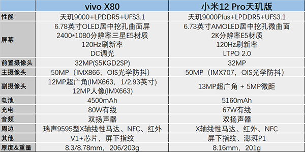 續(xù)航部分,vivo X80采用4500mAh電池+80W有線快充,小米12 Pro天璣版采用5160mAh電池+67W有線快充,前者充電速度有優(yōu)勢,后者電池容量有明顯優(yōu)勢。
