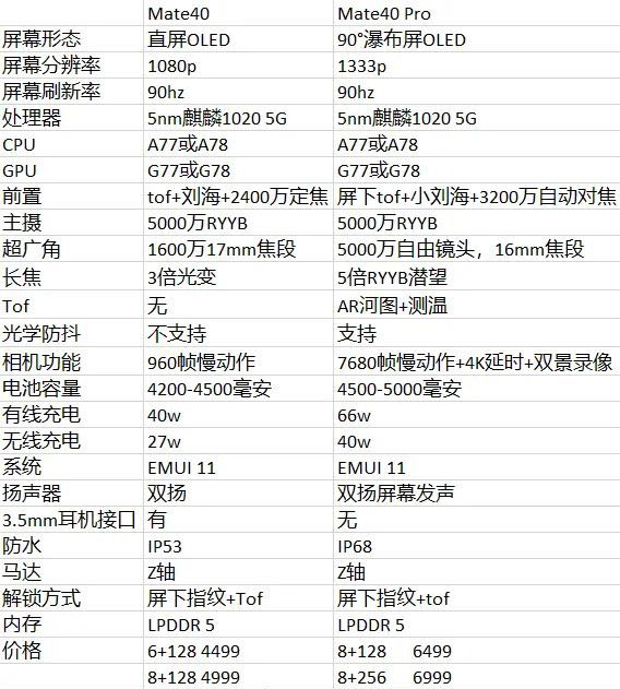 依據(jù)該表顯示,華為Mate40系列將會首發(fā)搭載麒麟1020 5G SoC,基于5nm工藝打造,相較現(xiàn)階段主流的7nm工藝集成度更高,能效比也更高。同時,華為Mate40系列將會全系配備90Hz刷新率屏幕,其中Mate40選配OLED直屏,Mate40 Pro則為OLED瀑布屏。