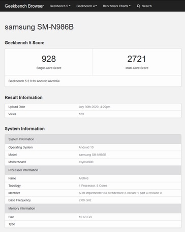 日前型號為“SM-N968B”的 Exynos 990 版 Galaxy Note 20 Ultra現(xiàn)身跑分庫,GeekBench 5.2單核成績?yōu)?28分,多核成績?yōu)?721分?,F(xiàn)在驍龍865+版的Galaxy Note 20 Ultra也現(xiàn)身跑分庫,型號為“SM-N986N”,單核成績?yōu)?84分,多核成績?yōu)?216分,表明在性能上驍龍版要優(yōu)于Exynos版本。