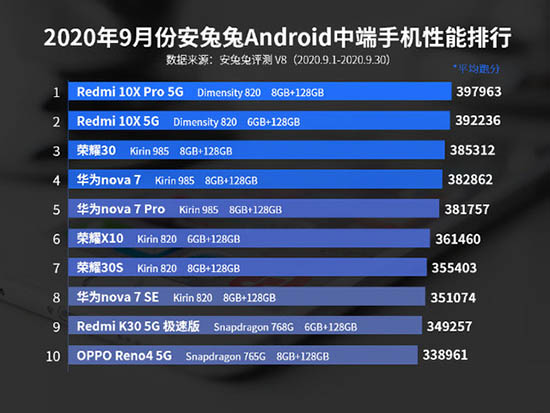 在中端手機(jī)性能榜單中,第三至第十名分別為榮耀30 385312分、華為nova7 382862分、華為nova7 Pro 381757分、榮耀X10 361460分、榮耀30S 355403分、華為nova7 SE 351074分、Redmi K30 5G極速版 349257分、OPPO Reno4 5G 338961分??傮w來看,華為和榮耀機(jī)型占據(jù)了榜單大多數(shù),其次便是Redmi。