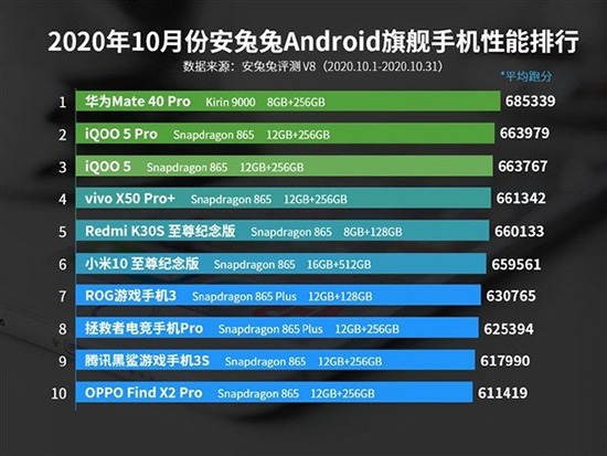 10月安卓性能榜出爐:華為Mate40 Pro第一 麒麟9000一騎絕塵