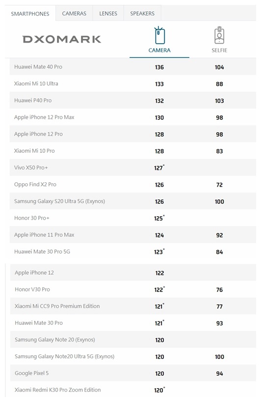 下面是目前DXOMARK智能手機相機排名: